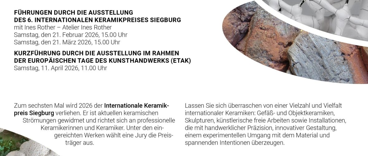 Der Internationale Keramikpreis Siegburg würdigt Keramiken in hoher handwerklicher Qualität und mit besonderem gestalterischen Anspruch. Prämiert werden ideenreiche Umsetzung, keramische Techniken und erweiterte Ausdrucksformen der Keramik.